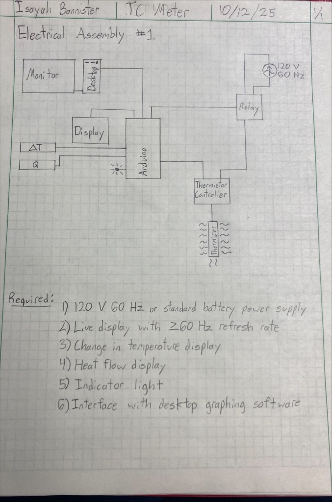 The Thermal Conductivity Meter (TC Meter) will heat a sample through applying a specific amount of energy that resistively heats a thermistor. Using temperature measurements taken before and after the energy is applied, the TC meter will be able to calculate the thermal conductivity of the material.