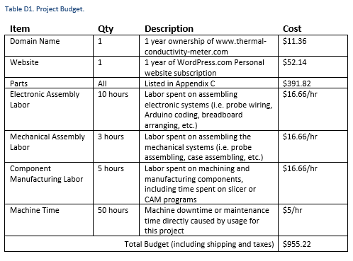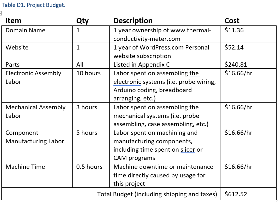 The current total project cost is estimated to be $612.52. This includes all part costs, labor, shipping, taxes, and time on machinery. The largest expense is labor, which totals $339.03 after taxes. This is followed by the parts cost, which is $240.80 after taxes. The maximum allowable project budget is $1000, which is closer to resembling the retail cost of currently retailed thermal conductivity testing machines.