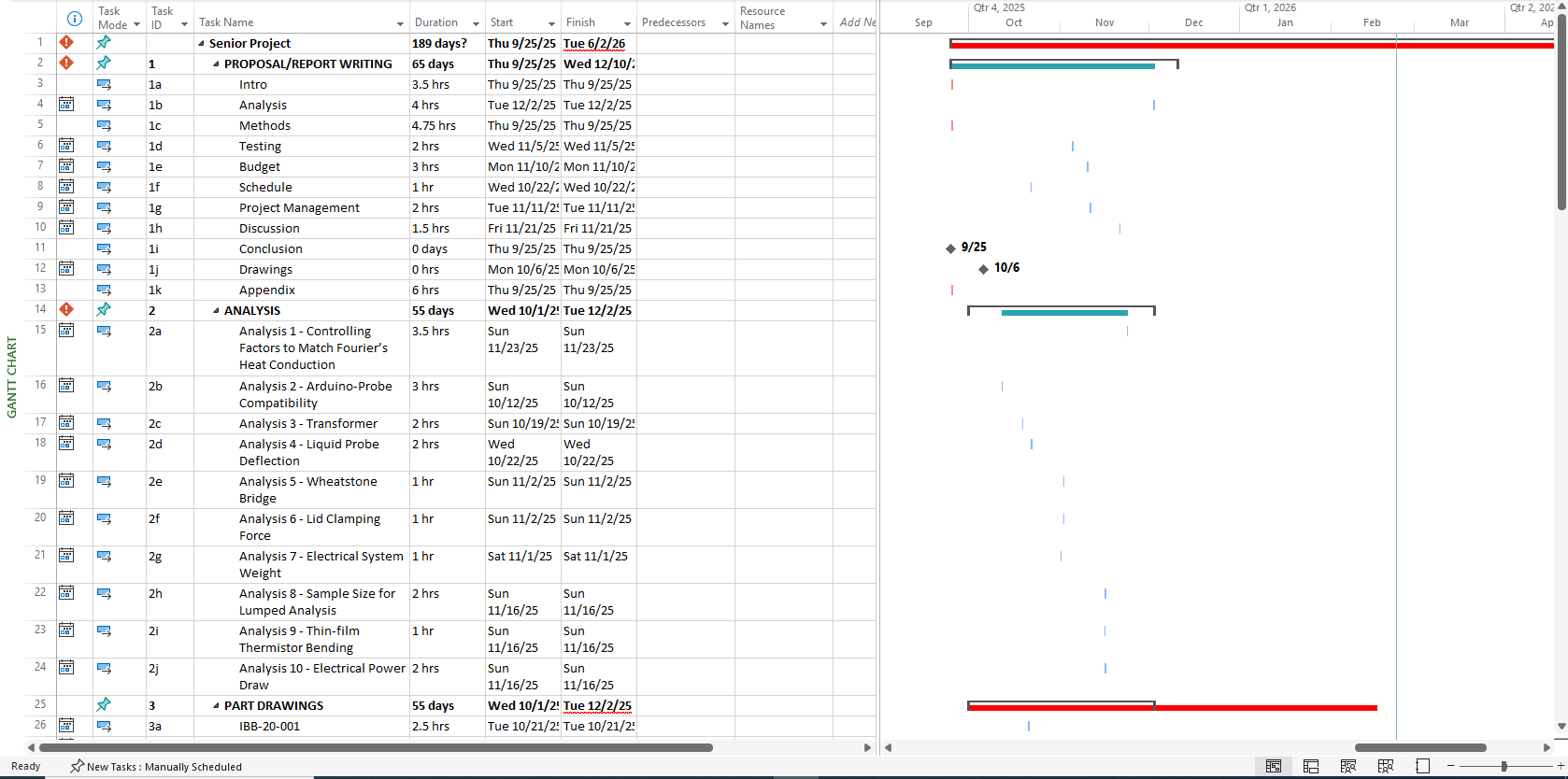 The report should be mostly done by December 10. All Analyses should be completed by December 2. Two hours every weekend has been allotted to complete one analysis, with two needing to be done every weekend. Similarly, two hours have been allotted per drawing. All drawings should be completed by December 2, but they will be revised during Winter quarter as needed.
