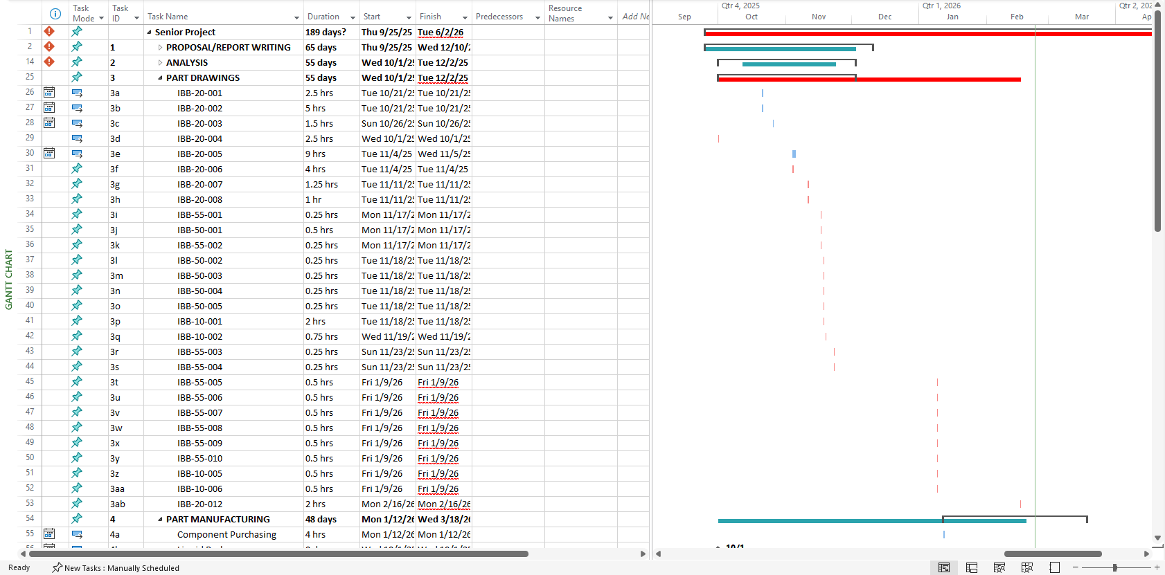 The completion of the three assemblies for the TCM should coincide with the due dates for 33%, 66%, and 100% construction completion. The scheduled time for this can be seen in Figure E3. As can be seen in the same figure, the manufacturing time for each component is not pre-scheduled. Time on component manufacturing will be logged as necessary whenever a component is worked on or completed. The goal of this freedom is to hopefully relieve some pressure while still maintaining targeted due dates for completion levels. 33% of construction was successfully completed by the due date, but the drawings had not been fully revised by Jan 23. If it becomes necessary, drawings and SolidWorks part revisions should become rigidly planned and scheduled.