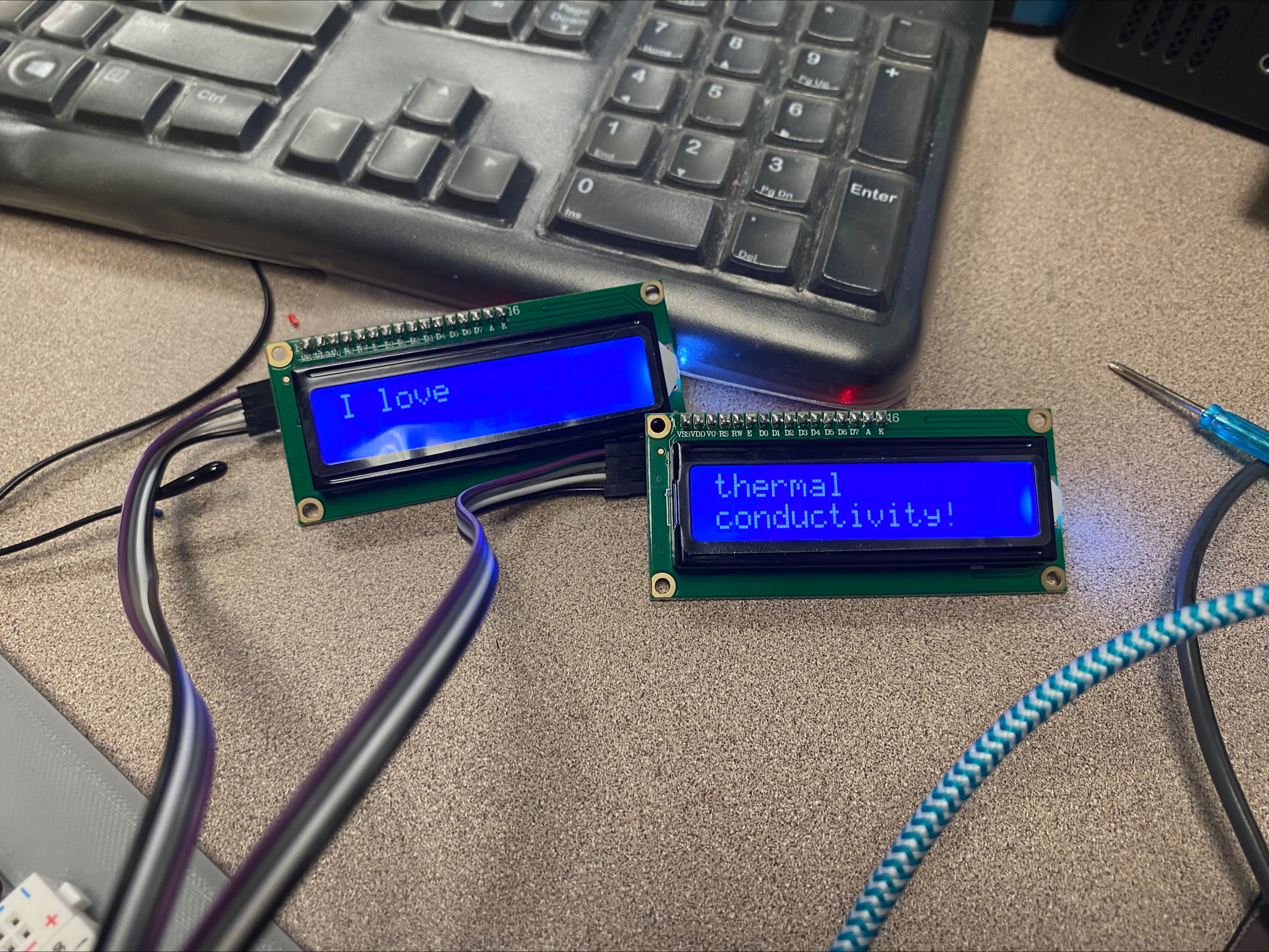 Testing I2C LCD screens. Compared to normal LCDs, I2C screens use the same ports, but have individual “addresses” which the Arduino can use to differentiate when sending data. This allows for much simpler wiring and coding.